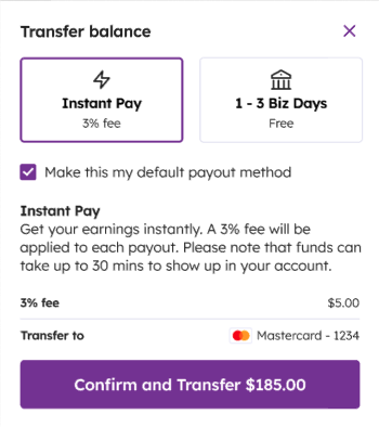 The next screen will explain the instant pay feature, including the 3% fee for using the feature. If you would like to proceed, select “Instant Pay”. (You can even make it your default payment method if you always want your earnings instantly!)